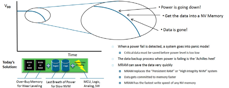 Compared to alternative non-volatile RAM solutions, MRAM eliminates the need for external components such as resistors, capacitors, batteries or super-capacitors including additional power fail logic circuitry. Theelimination of these components improves data fidelity and system form factor while providing the most reliable solution at the overall lowest cost. By enhancing data center and networking fault recovery, MRAM can reduce system downtime and also simplify system design providing an overall lower total cost of ownership.