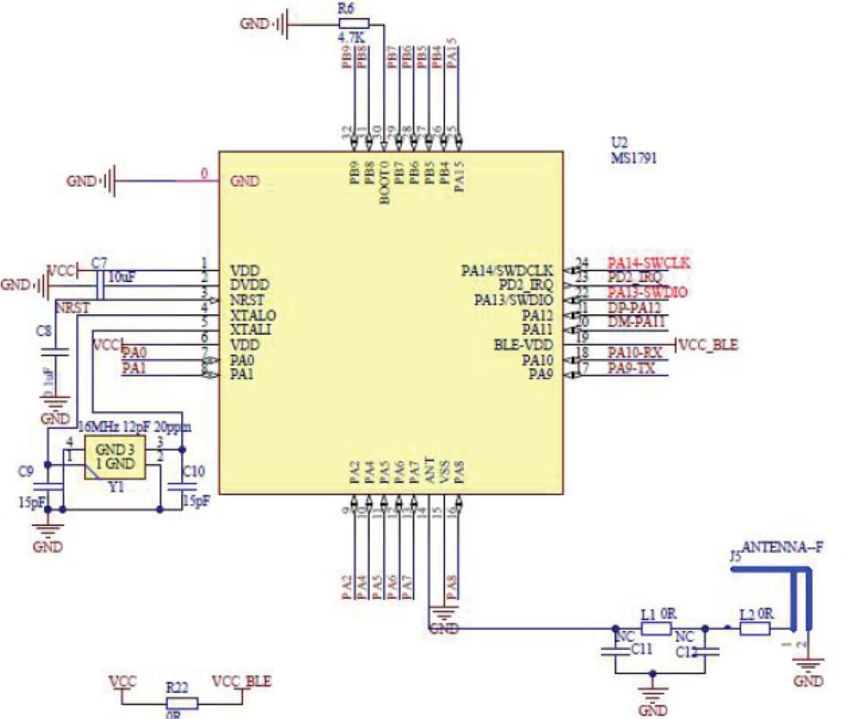 上海巨微MS1791是單模超低功耗藍牙芯片,射頻采用的是2.4GHzISM頻段的頻率,2MHz信道間隔,符合藍牙核心規(guī)范4.1。MS1791使用高性能的ARM Cortex-M0為內(nèi)核的32位微控制器,最高工作頻率可達48MHz,內(nèi)置高速存儲器,豐富的增強型I/O端口和外設連接到AHB和APB總線。