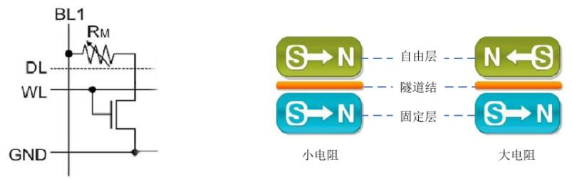 MRAM是以磁性隧道結(jié)(MTJ)儲(chǔ)存單元為基礎(chǔ)。MTJ中包含了一個(gè)維持單一極性方向的固定層,和一個(gè)通過(guò)隧道結(jié)與其隔離的自由層。當(dāng)自由層被施予和固定層相同方向的極化時(shí),MTJ的隧道結(jié)便會(huì)顯現(xiàn)出低電阻特性;反之MTJ便會(huì)有高電阻。此磁阻效應(yīng)可使MRAM不需改變內(nèi)存狀態(tài),便能快速讀取數(shù)據(jù)。當(dāng)流經(jīng)兩金屬線的電流足以切換MTJ的磁場(chǎng)時(shí),在兩金屬線交點(diǎn)的MTJ就會(huì)被極化(寫(xiě)入)。此過(guò)程能以