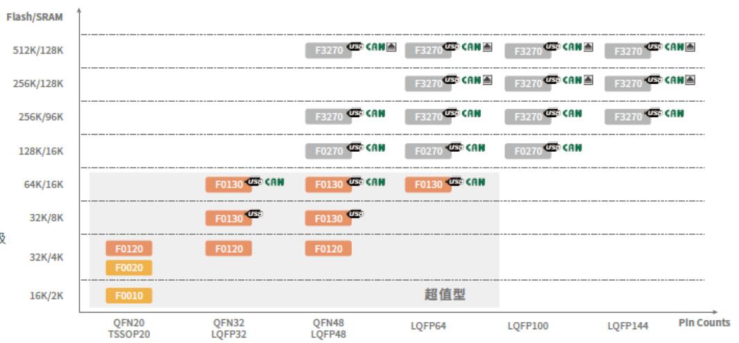 -Flash:16KB-64KB,SRAM:2KB-16KB,可選USBFSDevice和CAN總線接口