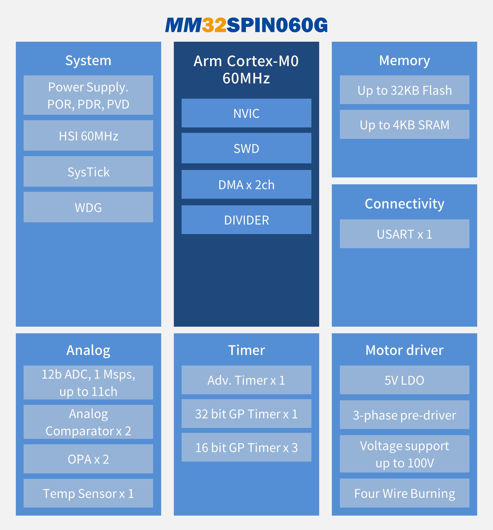 MM32SPIN060G存儲(chǔ)及運(yùn)算資源:32KB Flash,4KB SRAM,最高主頻60MHz,7個(gè)定時(shí)器資源:1個(gè)16位高級(jí)定時(shí)器、1個(gè)32位通用定時(shí)器、3個(gè)基本定時(shí)器、1個(gè)12位IWDG、1個(gè)24位Systick,支持2通道DMA,硬件除法器HW-Div,1路12位模數(shù)轉(zhuǎn)換器ADC,支持7通道,采樣速率1Msps,2路模擬比較器COMP、2路軌對(duì)軌運(yùn)算放大器OPAMP,三相N溝道柵極驅(qū)動(dòng)器,支持UART/SPI通信,內(nèi)部LDO支持工作范圍5.5~18V,預(yù)驅(qū)工作電壓高達(dá)100V,支持四線燒錄功能,工作環(huán)境溫度-40℃~105℃,提供QFN32封裝。適用于多種應(yīng)用場(chǎng)合,包括服務(wù)器風(fēng)機(jī)、泵類、風(fēng)機(jī)類、PWM通信控制電機(jī)應(yīng)用等。更多詳情請(qǐng)洽官方代理英尚微。