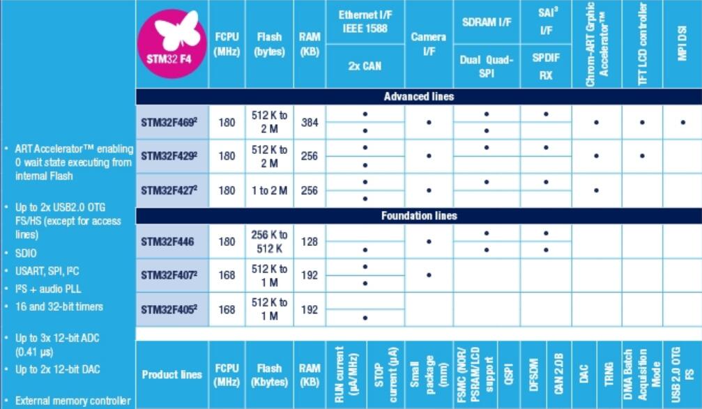 STM32F407/417–168MHzCPU/210DMIPS,高達1MB的閃存,添加了以太網MAC和攝像頭接口